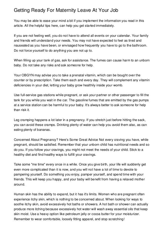 However even if you decide to work right up until your due date if you end up taking time off with a pregnancy related illness during your last month of pregnancy your leave will start then. Minnesota provides up to six weeks unpaid maternity leave to workers whose employer has 21 or more employees. To be eligible for the Maternity Benefit Act a woman must have been employed at the establishment for at.